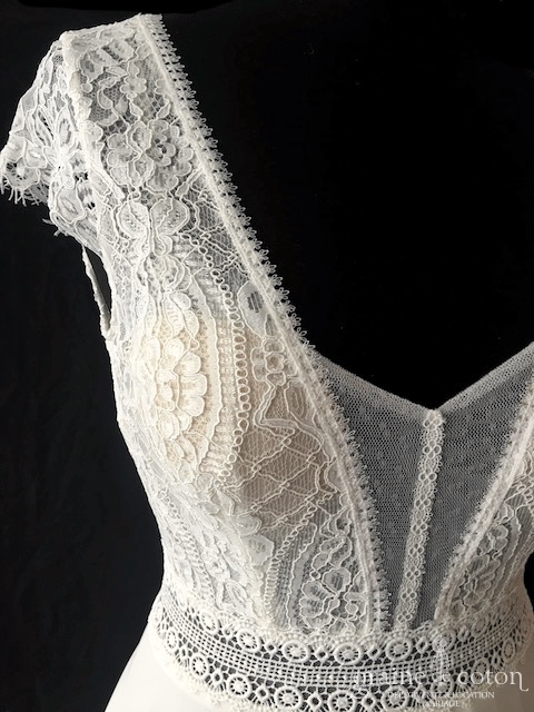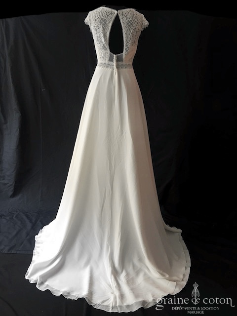 Robe une pièce ivoire clair : top en guipure et dentelle, encolure V recouverte de tulle plumetis. Dos nu triangle boutonné. Jupe en mousseline fluide taille haute avec empiècement de dentelle, légèrement évasée et avec traîne. Délicate et bohème chic.