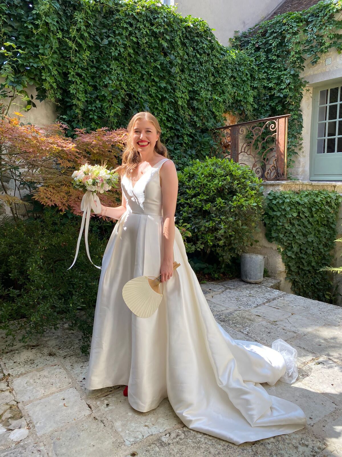 J’ai eu un coup de cœur immédiat pour cette robe lors des essayages et je suis vraiment très heureuse d’avoir pu la porter à mon mariage. Elle correspondait exactement à ce que je cherchais : élégante, un peu princesse et sobre à la fois. Je suis vraiment touchée de faire partie de la « chaîne de mariées » à qui cette robe a fait passer une merveilleuse journée.