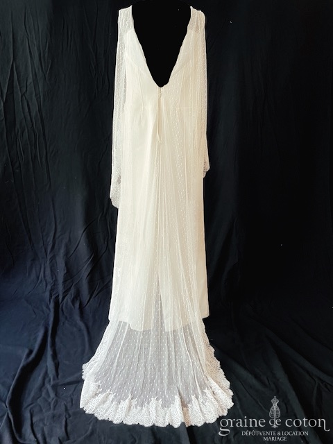 Combinaison une pièce ivoire clair : top à larges bretelles en tulle plumetis, bustier en crêpe recouvert de dentelle, dos nu. Pantalon en crêpe. Petite traîne cousue depuis les épaules et le dos, en dentelle, pouvant se relever. Originale, chic et bohème.