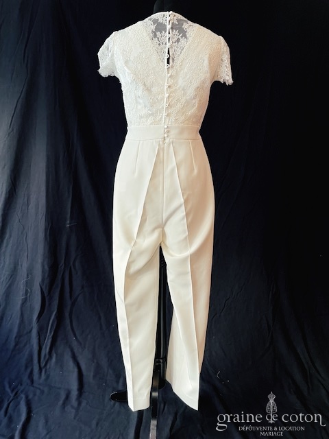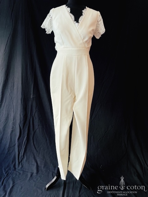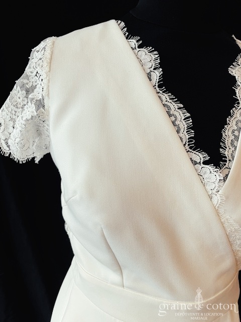 Combinaison en crêoe et dentelle ivoire clair : décolleté cache-coeur, petites manches et dos en dentelle transparente, dos boutonné. Coupe taille haute avec pli. Lumineuse, confortable et seyante.