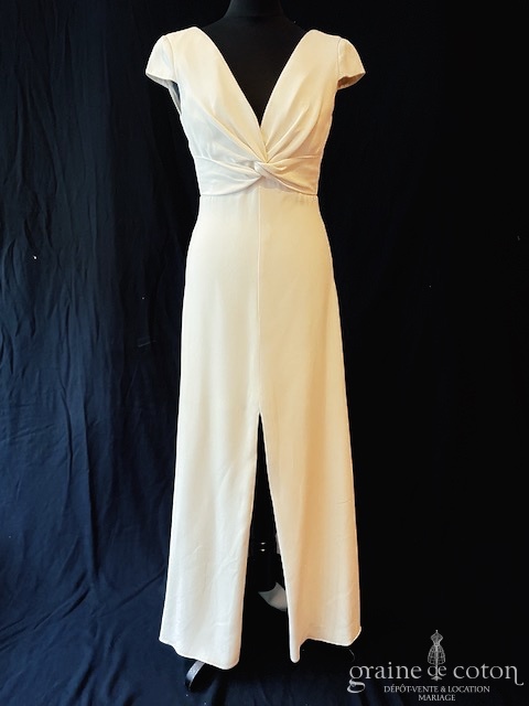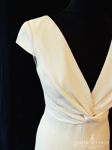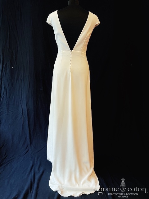 Robe une pièce en crêpe de soie ivoire : décolleté en V, nouage sous la poitrine, petites manches et dos nu. Jupe fourreau fendue sur le milieu avant, petite traîne. Chic et couture, magnifique matière.