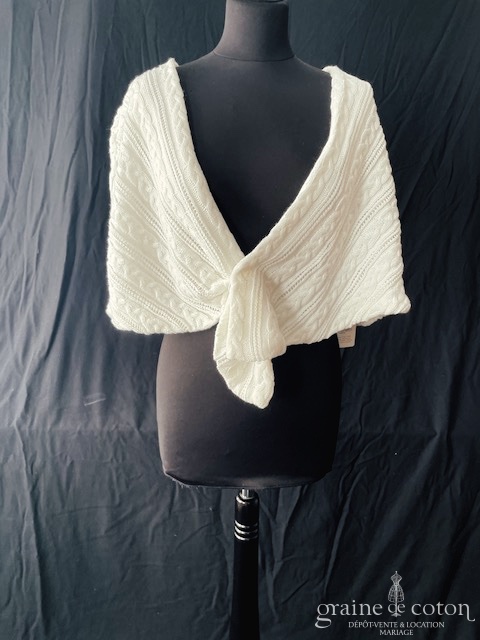 Étole / cape en maille ivoire se fermant par un système d’élastique invisible. Chaud et élégant pour les mariées de mi saison ;o)