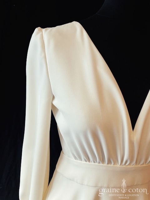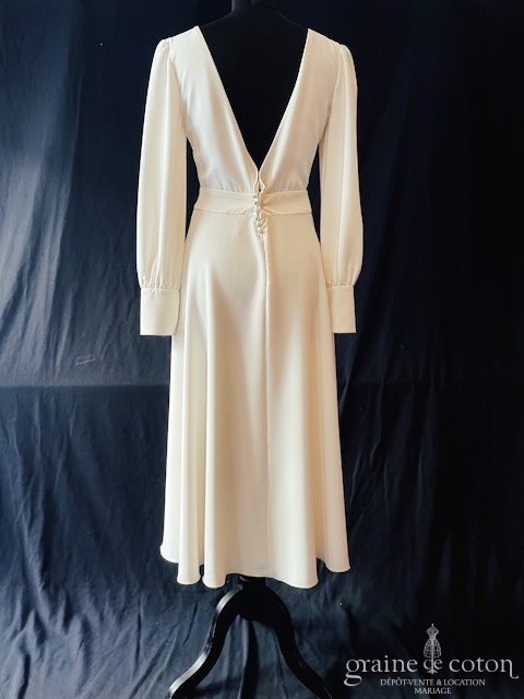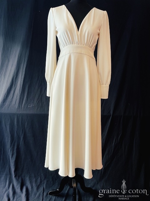 Robe une pièce en crêpe ivoire : top décolleté en V, manches longues et dos nu. Jupe taille haute longueur midi en crêpe fluide. Légère et raffinée.