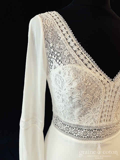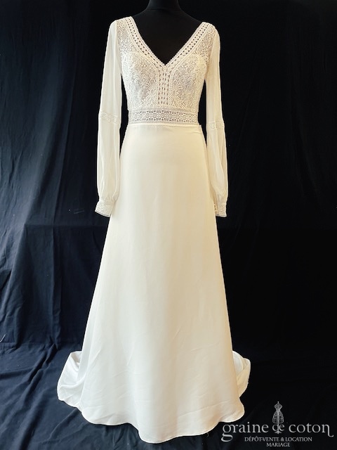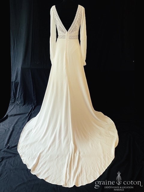 Robe une pièce ivoire clair : top décolleté en V avec larges manches en mousseline, beau dos nu encadré de guipure. Jupe taille haute en crêpe épurée légèrement évasée avec traîne plus sur-traîne amovible en mousseline (pressions et crochets). Sobre, élégante et bohème.