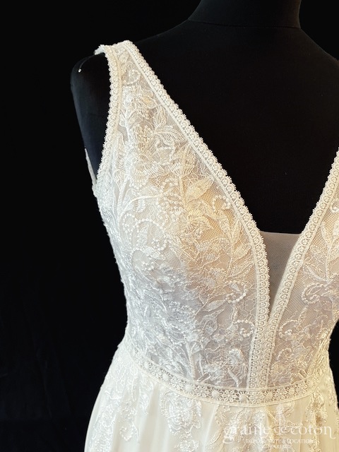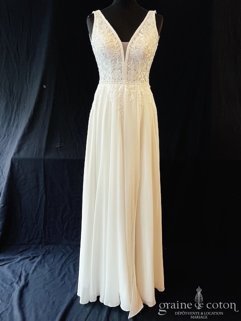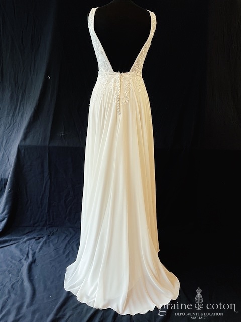 Robe une pièce ivoire clair : top en dentelle avec décolleté V, beau dos nu. Jupe taille haute fendue en mousseline fluide épurée, petite traîne. Légère, lumineuse et glamour.