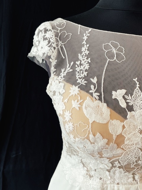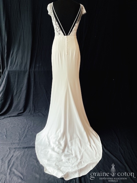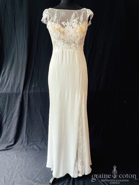 Robe une pièce ivoire clair : top en tulle dentelé encolure bateau, petites manches et dos nu. Jupe fourreau en crêpe de soie, taille haute, fendue sur une quille de dentelle, petite traîne. Glamour, chic et bohème.