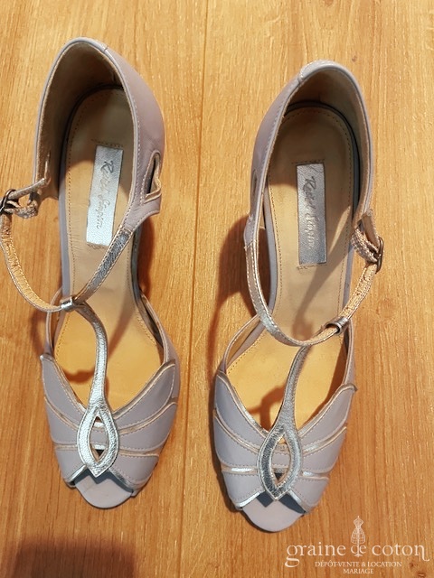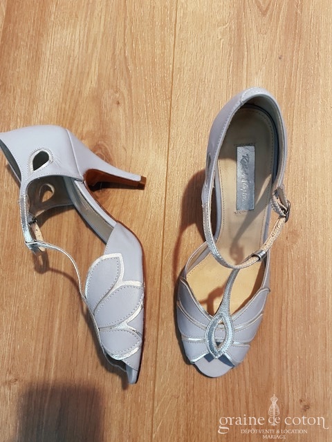 Escarpins en cuir bleu clair et argenté, bout ouvert et lanière cheville. Talon de 8 cm. Dust bag inclus.
