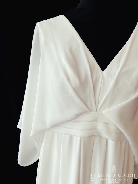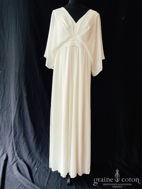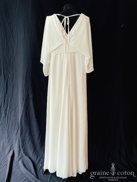 Combinaison ivoire clair tout en mousseline : top décolleté en V avec manches façon chauve souris, dos nu. Pantalon taille haute à jambes larges. Fluide, confort et moderne !