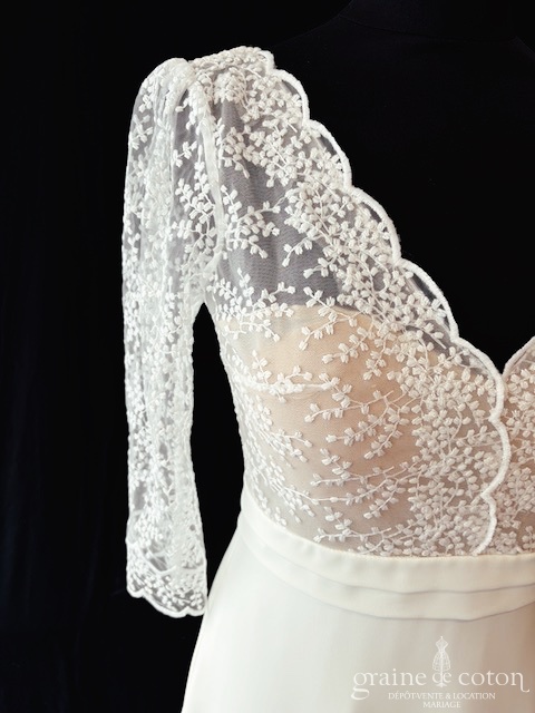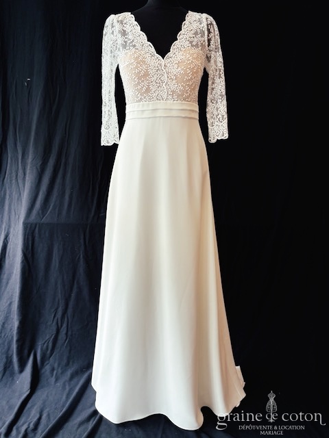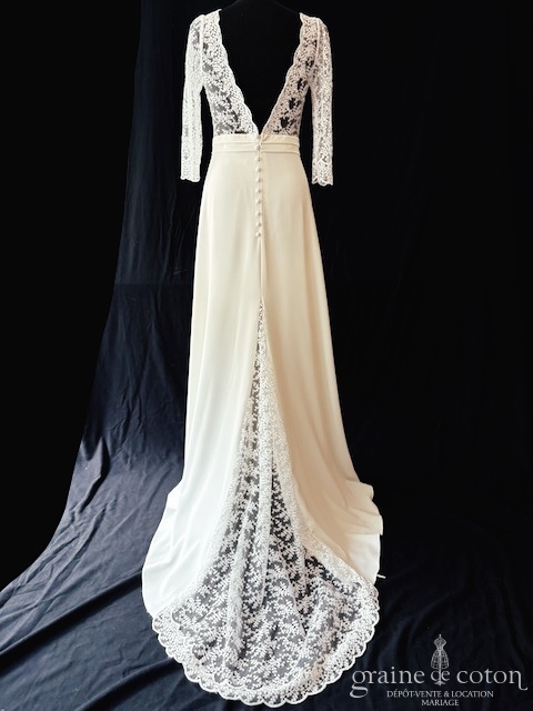 Robe une pièce ivoire : top en guipure avec manches 3/4, décolleté V et dos nu. Jupe taille haute ceinturée en crêpe épuré, traîne avec quille de dentelle. Chic, bohème et raffinée.
