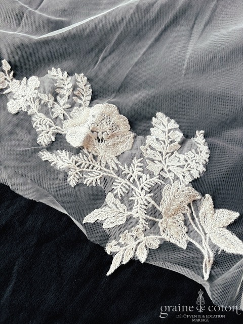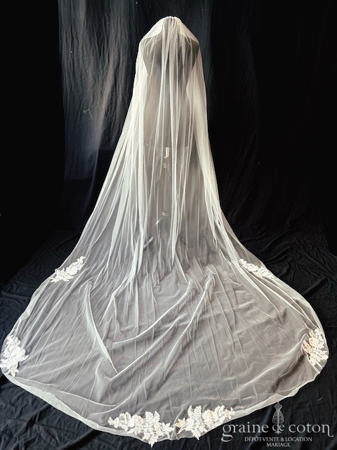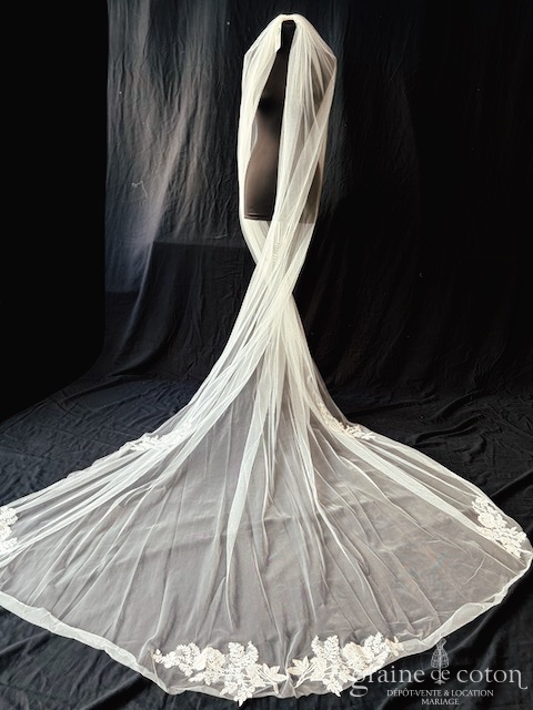 Voile long de 300 cm en « soft tulle » ivoire bordé de dentelle pailletée. Monté sur peigne, sans rabat avant.