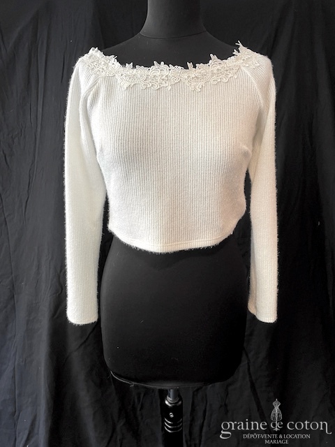 Pull court en laine mélangée effet cachemire : manches longues, dos fendu fermé par des boutons sur le haut et le bas, encolure bordée de dentelle. Idéal pour les mariées de mi-saison ou les soirées d’été fraîches.