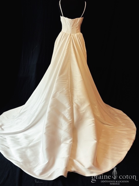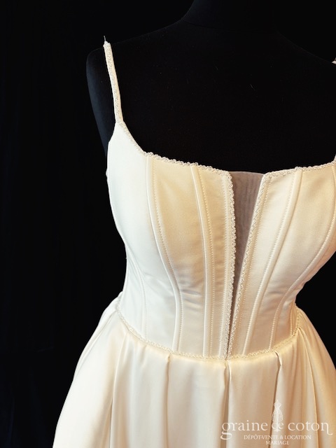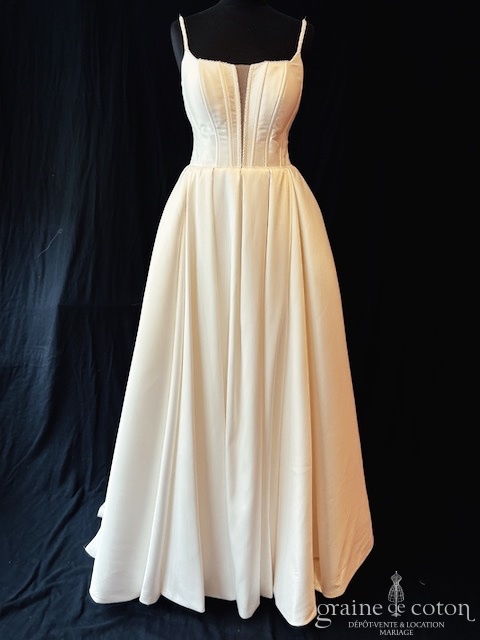 Robe une pièce en mikado ivoire clair : encolure carré avec bretelles perlées, bustier corseté pour une bonne tenue avec décolleté en V recouvert de tulle. Jupe taille haute à plis creux, épurée, poches et traîne. Lumineuse et seyante.