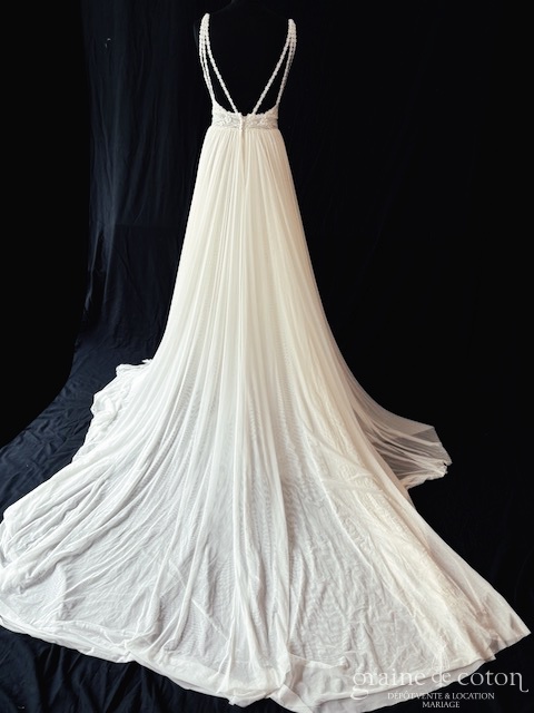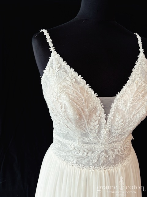 Robe une pièce ivoire clair : top en dentelle délicatement perlée avec fines bretelles et dos nu, décolleté plongeant en V. Jupe taille haute en tulle fluide effet mousseline, fendue sur le côté devant, longue traîne. Bohème féérique.