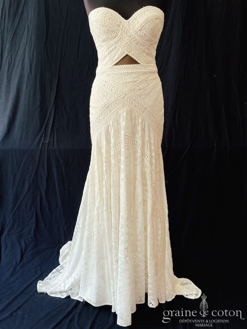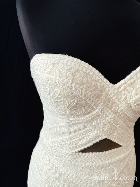 Robe une pièce en mousseline de soie et guipure de coton ivoire clair : bustier coeur ajouré sur la taille, ceinture. Jupe fourreau taille haute fluide avec longue traîne pouvant se relever. Somptueuse, bohème et glamour.