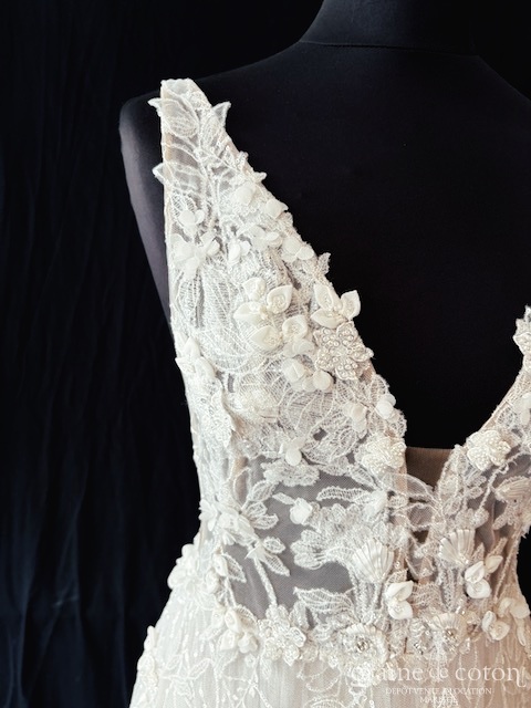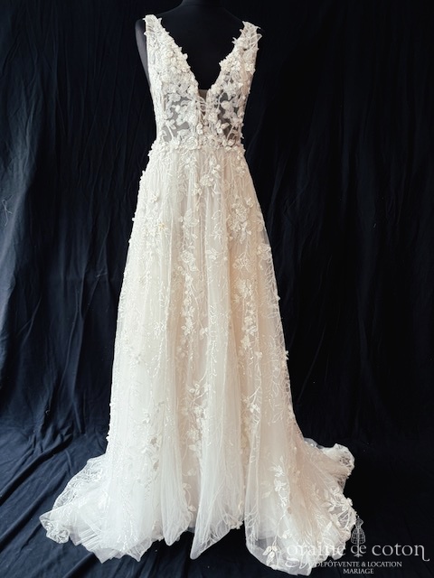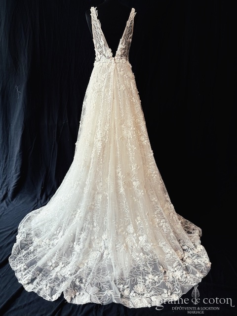Robe une pièce tout en dentelle pailletée ivoire, fond de robe nude : décolleté en V et dos nu. Jupe taille haute fluide fluide avec petite traîne. Féérique et seyante !