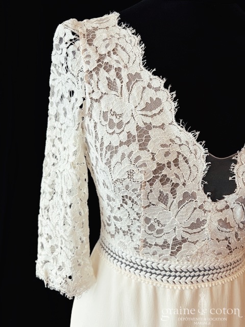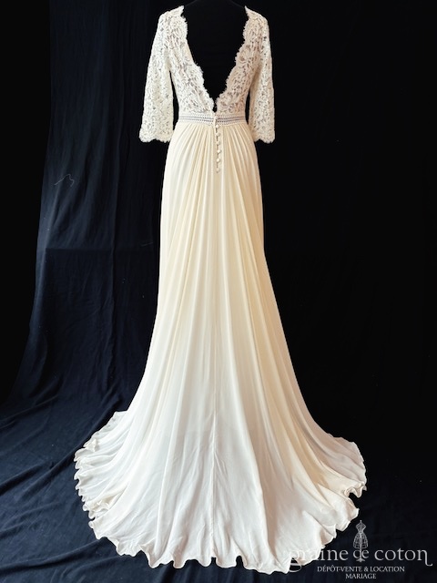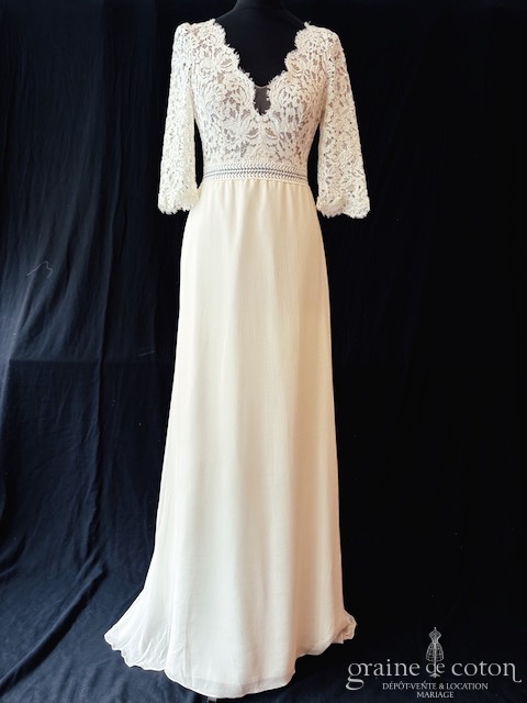 Robe une pièce ivoire : top en dentelle avec manches 3/4, décolleté en V et dos nu. Jupe taille haute en mousseline de soie, épurée, avec traîne. Bohème chic.