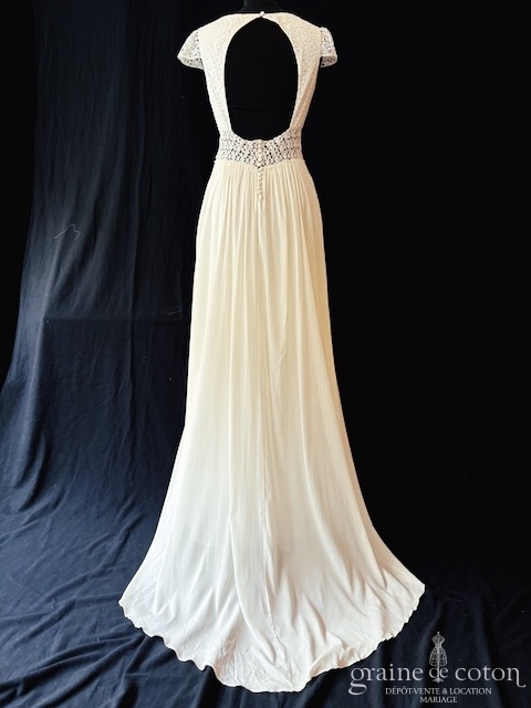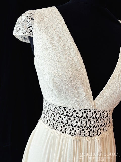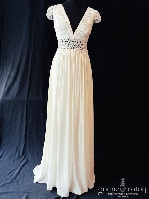 Robe une pièce ivoire : top en dentelle décolleté profond en V, petites manches et dos nu triangle. Jupe taille haute avec empiècement de dentelle, en mousseline de soie fluide épuré, petite traîne. Bohème chic.
