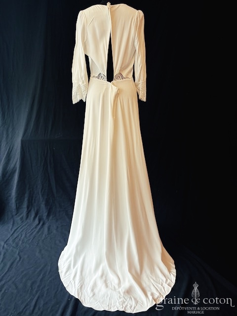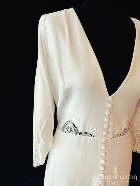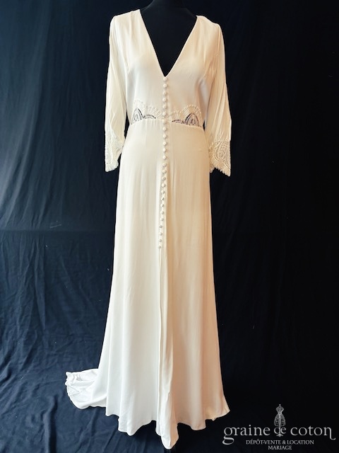 Robe une pièce en crêpe de soie ivoire : top décolleté en V avec manches 3/4, dos ouvert géométrique, empiècements de dentelle. Jupe taille haute fluide fendue devant milieu avec boutons, petite traîne. Originale, chic et raffinée.