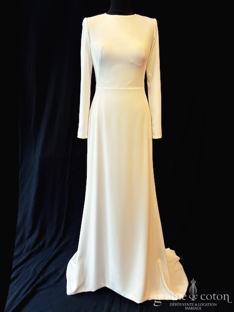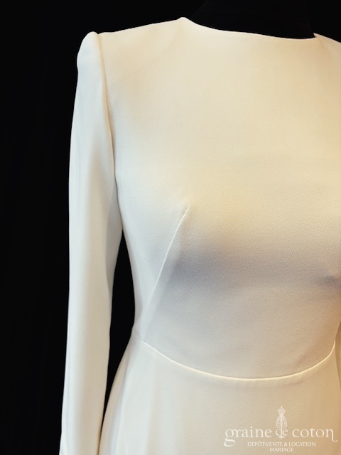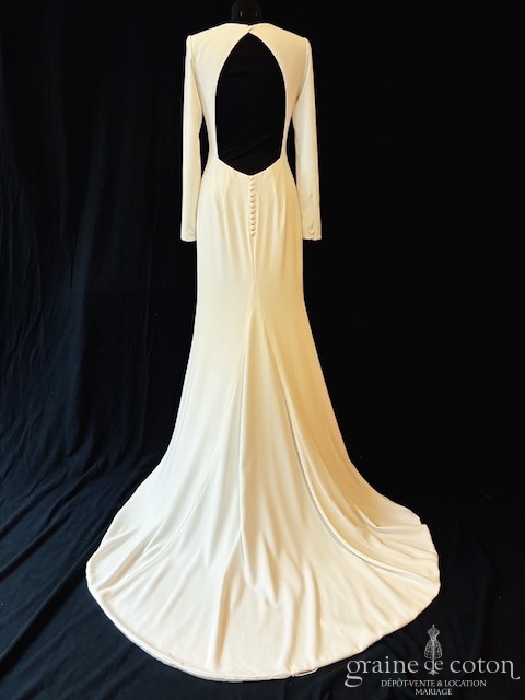 Robe une pièce tout en crêpe ivoire clair : top encolure fermée à manches longues, dos nu. Jupe taille haute coupe fourreau légèrement évasée, sobre et épurée, avec petite traîne. Chic et glamour.