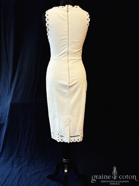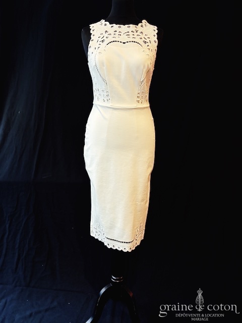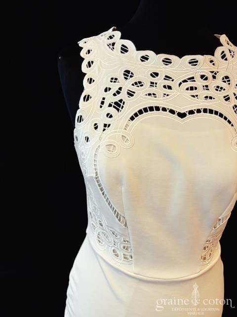 Robe une pièce en crêpe strech crème : encolure ronde, larges bretelles, découpes effet dentelle sur le jupe. Jupe taille haute crayon sous le genou. Élégante et intemporelle, idéale pour une cérémonie civile.