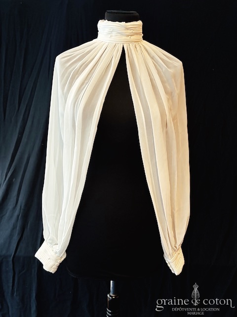 Boléro cape col montant drapé en mousseline fluide avec manches longues et petites perles nacrées. Fermeture manches et col par des boutons recouvertes. Idéal pour une cérémonie religieuse ou pour ajouter des manches de façon temporaire à une robe ;o)