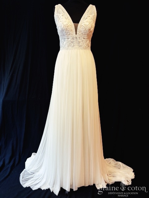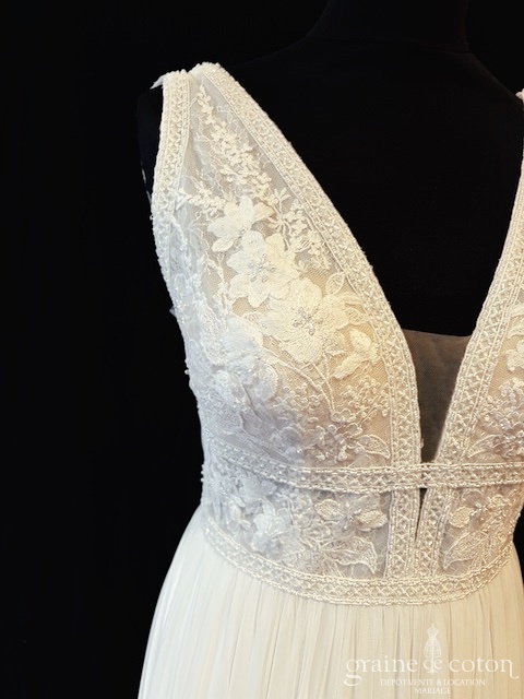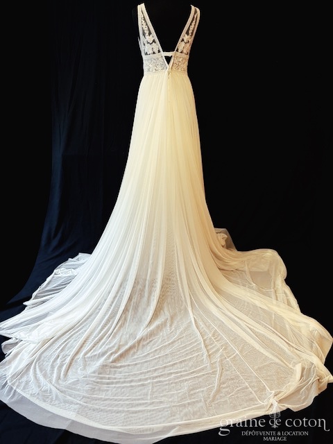 Robe une pièce ivoire clair : top en dentelle perlée, décolleté en V et dos nu, bretelles. Jupe taille haute en tulle extra souple, fendue, avec longue traîne.