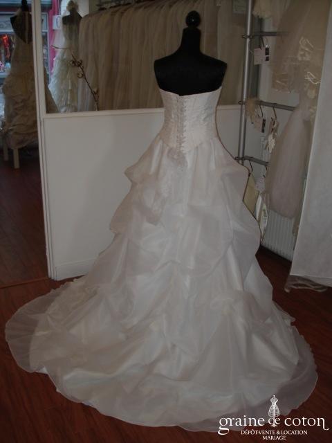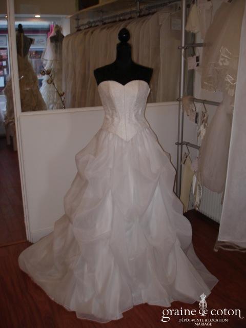 Robe blanche deux pièces : bustier en pointe pour affiner encore la taille et dos lacé. Jupe en organza relevée par endroits avec des plumes, sensation aérienne de la robe !