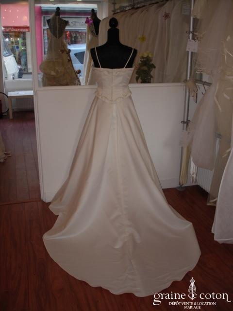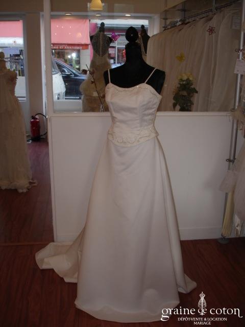 Robe deux pièces ivoire : bustier brodé très délicatement de perles grises et ivoire, très discret. Jupe trapèze simple, sans perle ni broderie, avec une longue traîne partant de la taille avec un élégant pli. Matières très agréables, avec beaucoup de tenue.