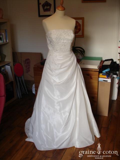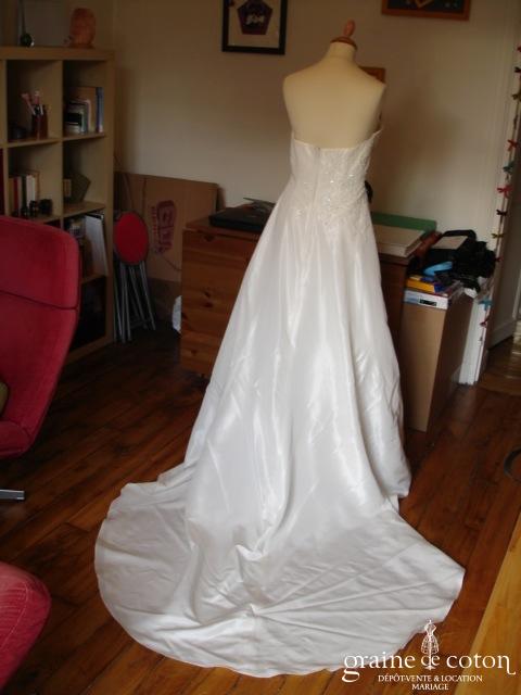 Robe une pièce blanche : bustier drapé à la taille et perlé. Une longue traîne vient terminer cette robe confortable, à la coupe avantageuse.