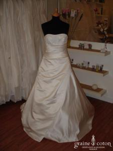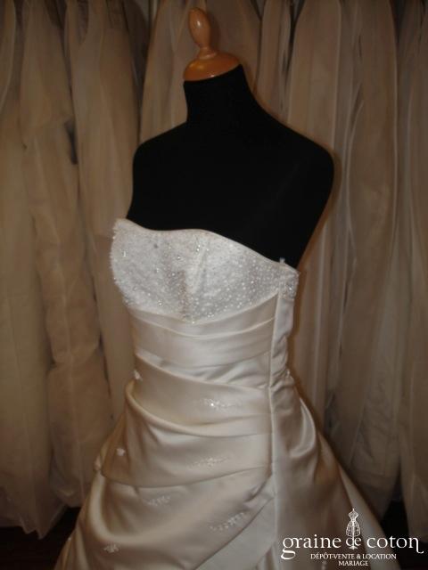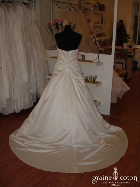 Robe ivoire clair une pièce : bustier drapé et finement perlé sur le décolleté. Drapé à la taille puis jupe simple avec quelques perles, longue traîne et petits boutons le long de la fermeture dos.