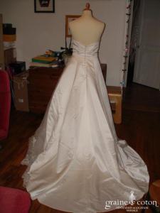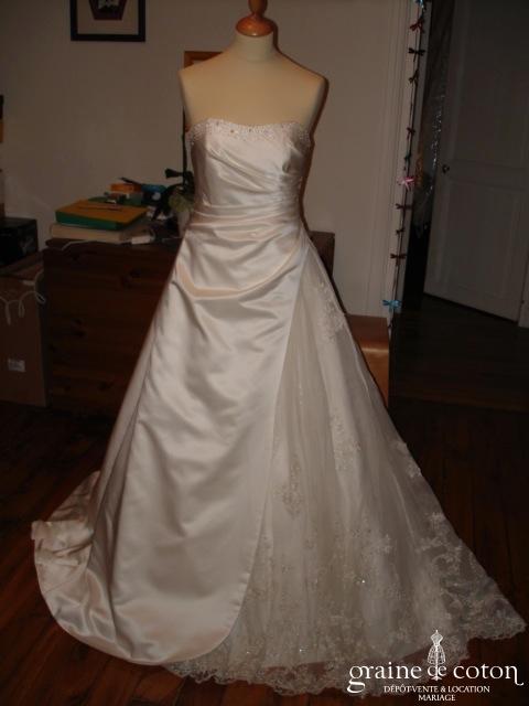 Robe une pièce couleur ivoire. Bustier drapé et perlé le long du décolleté. La robe est ouverte sur le côté, laissant apparaître de l’organza finement brodé et perlé. Dos avec petits boutons imitation perles. Jupon supplémentaire non nécessaire.