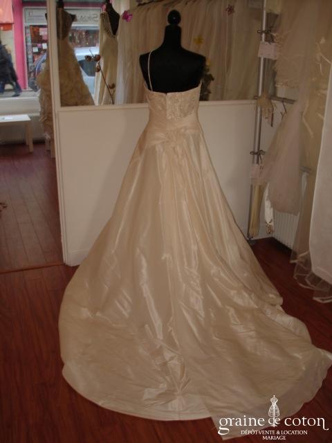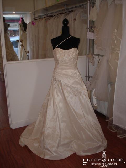 Robe ivoire une pièce, type bustier avec une bretelle autour du cou. Drapé à la taille et dans le dos, à partir duquel la robe s’évase en deux parties. Beaux perlages du bustier et d’une partie de la jupe. Longue traîne.