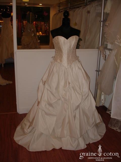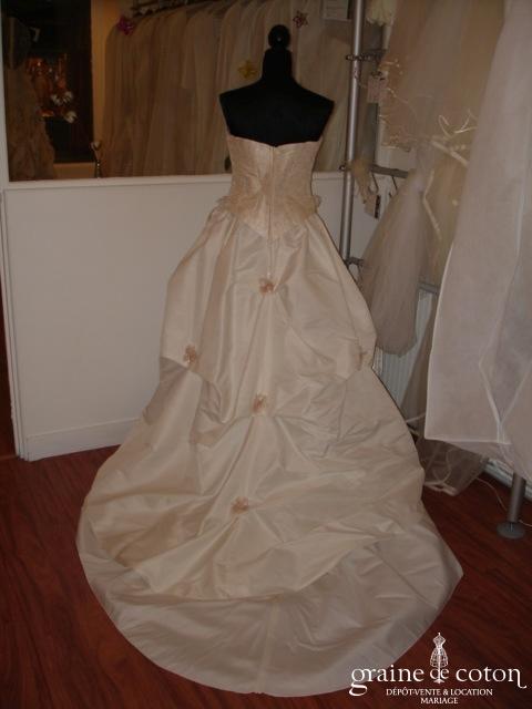 Robe deux pièces couleur ivoire et champagne. Bustier lacé sur les côtés, en pointe pour affiner encore la taille. Jupe ivoire relevée par des petites fleurs, effet « nuage ».