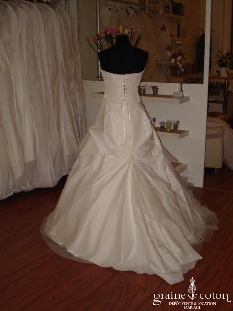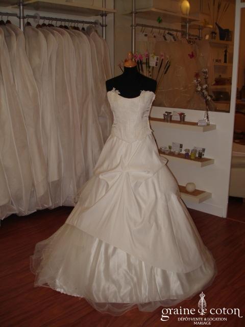 Robe deux pièces couleur ivoire : bustier effet froissé avec guipure de dentelle et dos lacé. Jupe relevée par endroit avec alternance asymétrique de tissu, de mouchoirs de tulle et de tulle. Dos de la jupe relevé avec guipure de dentelle. Simple sans être épurée, élégante, efficace !