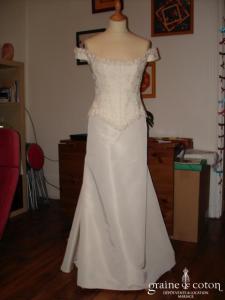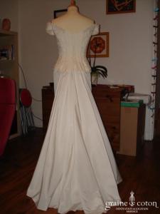 Robe exceptionnelle en deux pièces : bustier travaillé avec manches tombantes sur les épaules, jupe près du corps taille haute élégamment plissée sur l’arrière, fermée par 3 boutons perlés, pour un port de princesse. Jupon non nécessaire. Couleur ivoire.