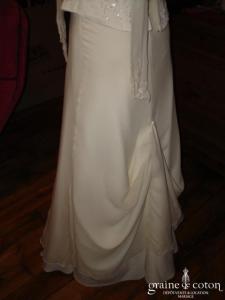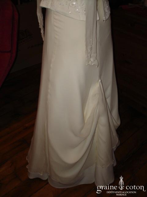 Robe crème en 2 pièces : bustier délicatement perlé et brodé, jupe en mousseline de soie pour un mouvement tout en délicatesse. La traîne peut se remonter en drapé. Jupon ceinture élastique avec plusieurs couches de tulle et housse inclus.