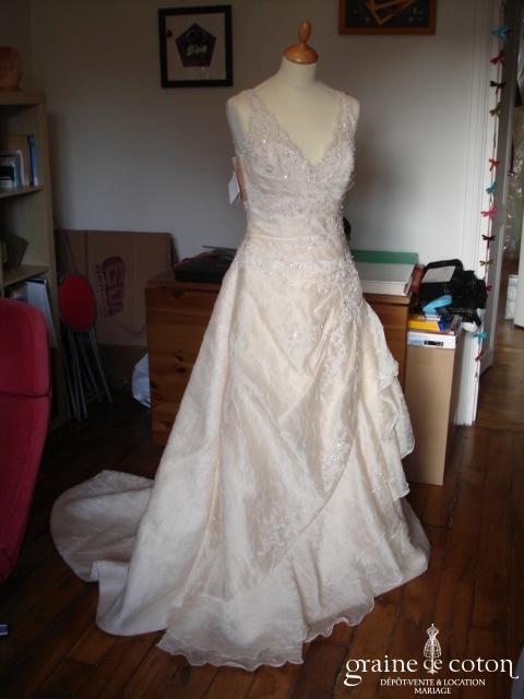 Robe une pièce drapée avec dentelle et perles. Bustier avec bretelles en dentelle, traîne et dos fermé par de petits boutons ronds recouverts. Couleur or.
