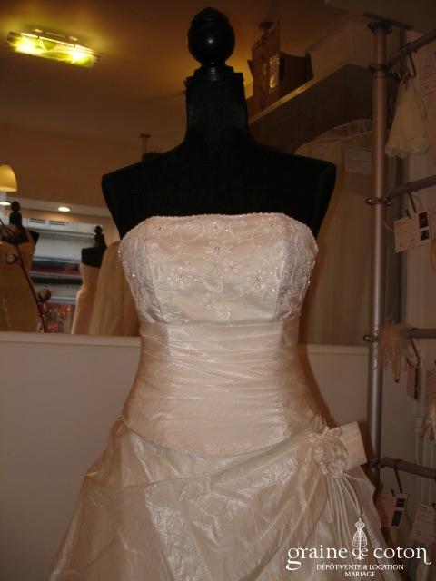 Robe bustier ivoire moiré, finement perlée, drapée à la taille. Petits boutons sur le dos du bustier. Fleur relevant le drapé sur le haut de la jupe. Longue traîne. Jupon inclus.