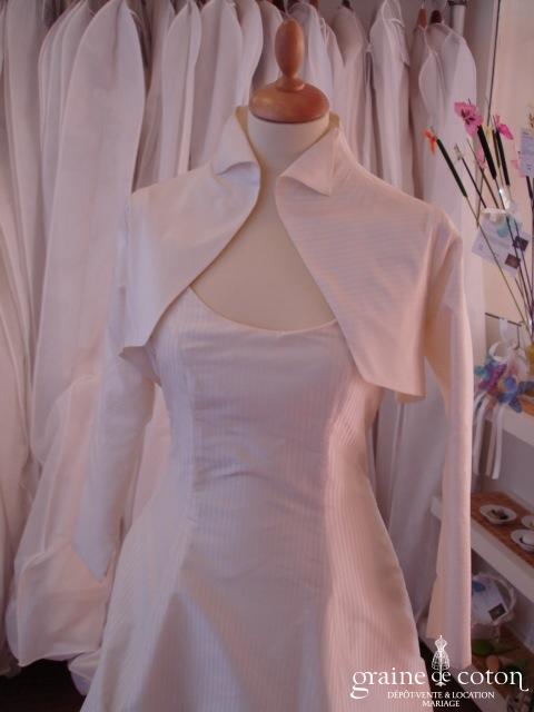 Robe une pièce entièrement en soie ivoire avec de fines rayures : manches longues amovibles en mousseline de soie. Boléro court assorti. Matières exceptionnelles, grande qualité et élégance garanties !