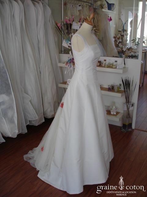 Robe une pièce blanche : décolleté carré bordé d’un galon rappelant la Rome antique. Épurée devant, elle se lace dans le dos et s’ouvre sur du tulle décoré de roses en tissu amovibles. Dos très original, tranchant avec le devant classique, pour surprendre vos invités !