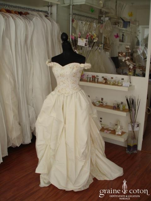 Robe deux pièces ivoire : bustier brodé de fleurs jaune doré, petites manches tombant sur les épaules, dos échancré et lacé. Jupe avec une jolie tenue, ivoire, relevée sur le côté, laissant apparaître le même tissu que le bustier.