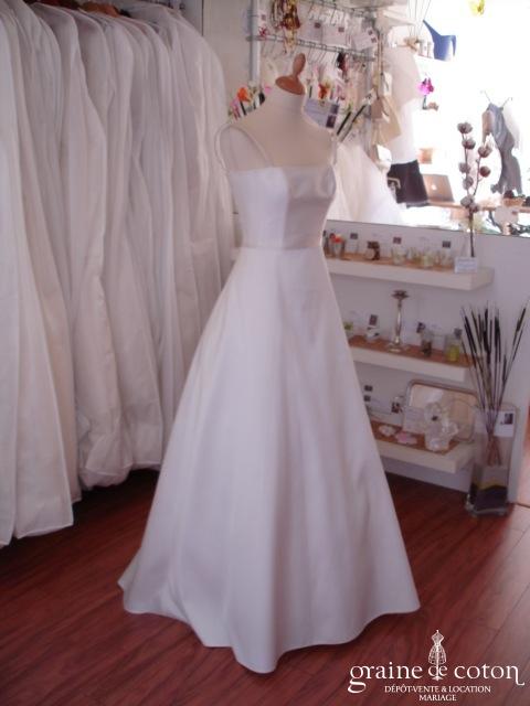 Robe une pièce en mikado de soie ivoire : bustier travaillé en plusieurs pans, fines bretelles, double ceinture de satin à la taille et dos lacé avec profond décolleté. Jupe forme trapèze avec petite traîne. Style épuré, belles matières, élégance garantie !