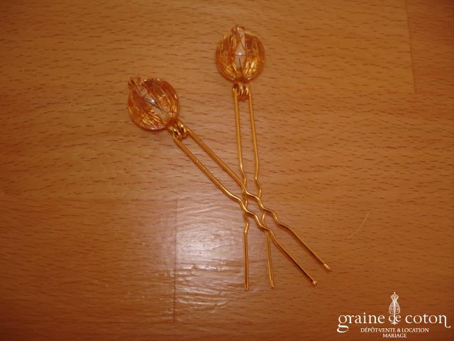 Lot de 2 pics à chignons avec grande boule transparente et dorées, petit strass.