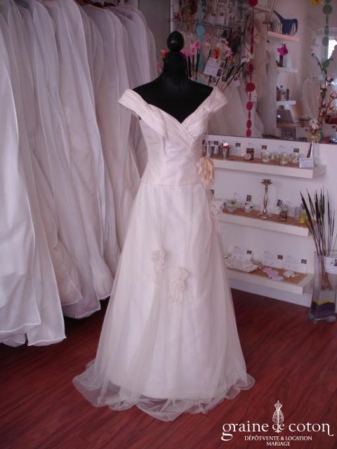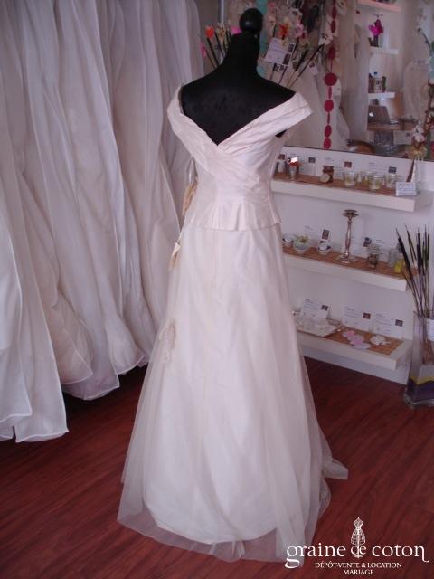 Robe deux pièces ivoire en soie sauvage : bustier avec large drapé tombant sur les épaules et croisé dos et devant. Jupe en soie recouverte de tulle avec rubans d’organza. Belle coupe et grande élégance.