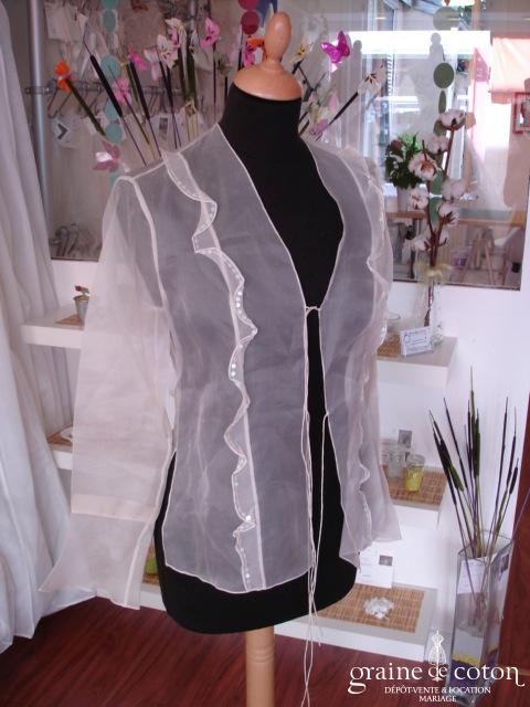 Veste manches longues pouvant faire office d’étole de mariée : organza de soie ivoire avec volants pailletés, fermeture sur le devant par deux fins lacets. Confortable et léger.