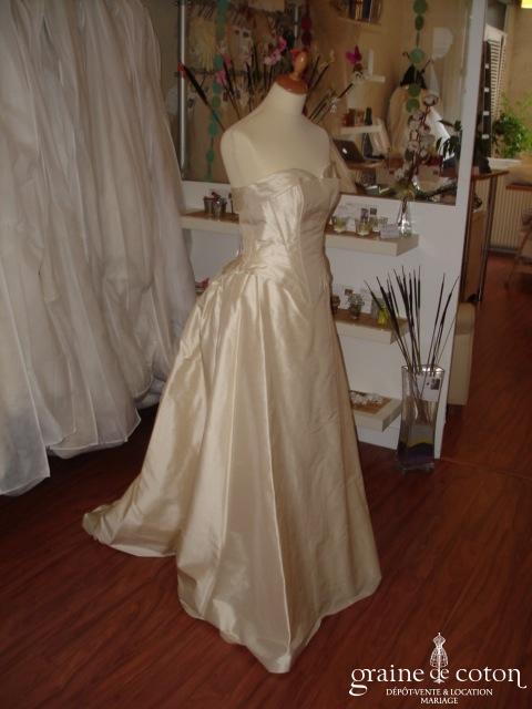 Robe deux pièces en soie sauvage ivoire : bustier décolleté coeur, lacé dans le dos. Jupe trapèze avec relevé type « faux-cul » sur l’arrière. Robe épurée et très élégante. Housse incluse.
