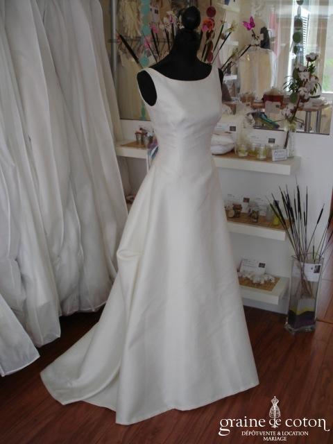 Robe une pièce en mikado épais ivoire : devant épuré avec bretelles, dos au profond décolleté en V se terminant par de petits boutons. Jupe forme trapèze avec plis, système de lanières pour relever la traîne. Style extrêmement épuré mais original, très classe.