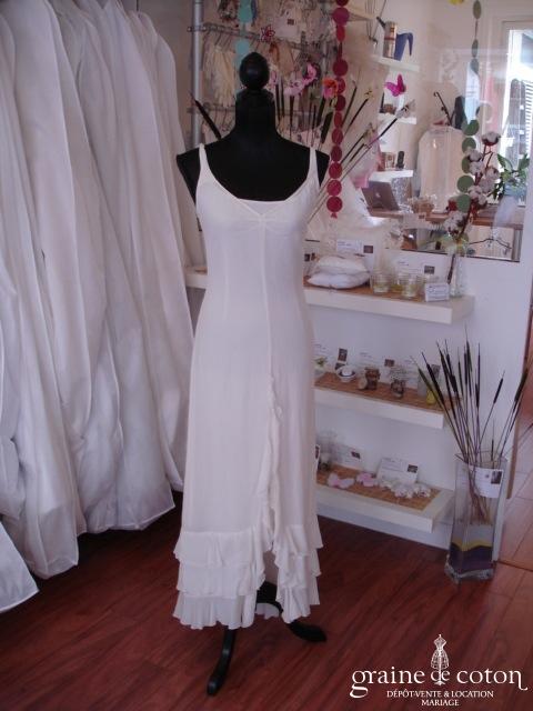 Robe en deux pièces fluide ivoire : robe courte se portant avec une sur robe plus longue en mousseline plissée, avec volants sur le bas. Frais et léger.