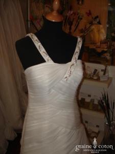 Robe une pièce en mikado d’organza ivoire : bustier simplement drapé, bretelles larges avec pierreries, jupe drapée avec systèmes de rubans pour relever la traîne. Sobre, très élégante. Jupon et housse inclus.