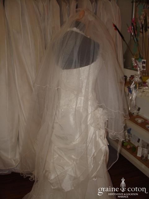 Voile mi long ivoire avec petites perles nacrées, monté sur peigne, bords surjetés. Aérien et d’une longueur idéale.